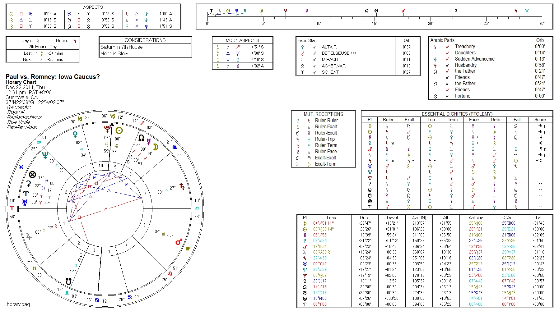 If we do another horary on the Iowa political contest, which Intrade now has Romney at 38% favored to win, against Paul’s 33% respectively, then you reverse Horary House allocation. In that case Romney would be the Favorite – 1st House, and Paul the Underdog – 7th House.