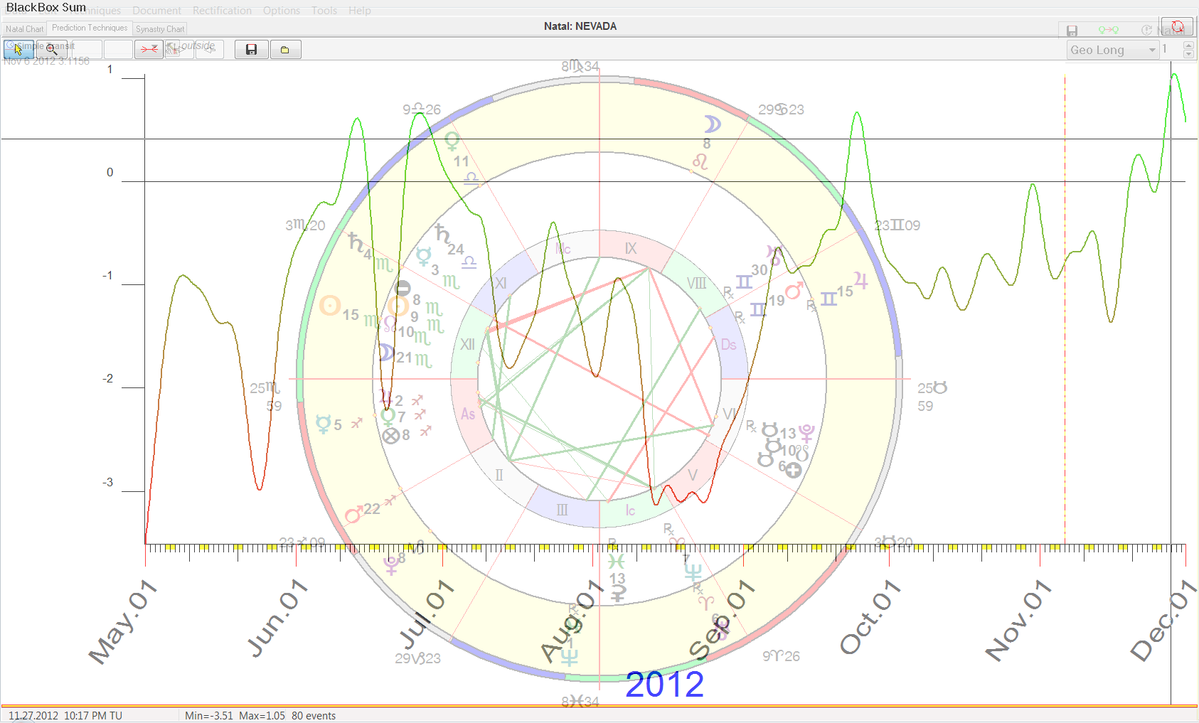 Democratic nominee President Obama has a 64% probability of winning Nevada according to Intrade. But the composite polls on May 24th show that Neveda is barely Democratic with Obama 48% and Romney 46%, respectively. However, if you consider Neveda’s staggering unemployment rate, its history of voting for Republicans in seven of the last ten presidential elections, its large Mormon population, along with the Neveda’s economic Blackbox forecast (based on the state’s horoscope), the deck is stacked against Obama.