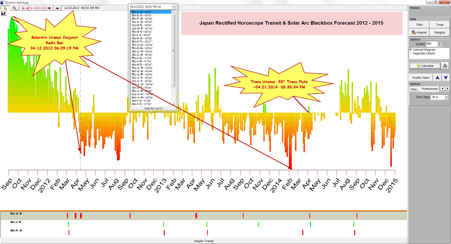 As of this writing in the spring of 2012, the follow secular data below shows that “dark clouds” have been forming over the Japanese economy for the past 24 months as the Uranus-Pluto alignment approaches:
