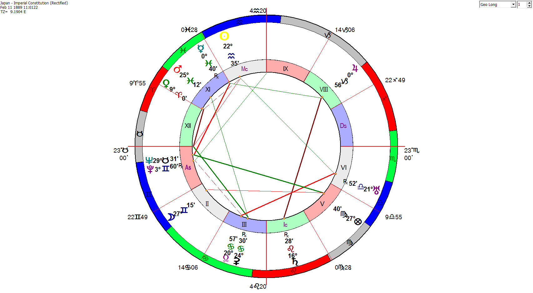 The horoscope of modern Japan that traces its origins to February 11th, 1889, based on the promulgation of the Meiji Constitution* is based on 42 historically accurate events in Japanese history from the Nara Period to the current one. The rectification method employed transits, secondary progressed and solar arcs movements using the latest expert system analysis. Although the evidence from the event data appears to be compelling, the rectification is still speculative. Therefore by no means is this an attempt to pass off this rectified time as the verified time for the horoscope for Japan, but rather a starting point for further speculation for Japan in 2012 and beyond.