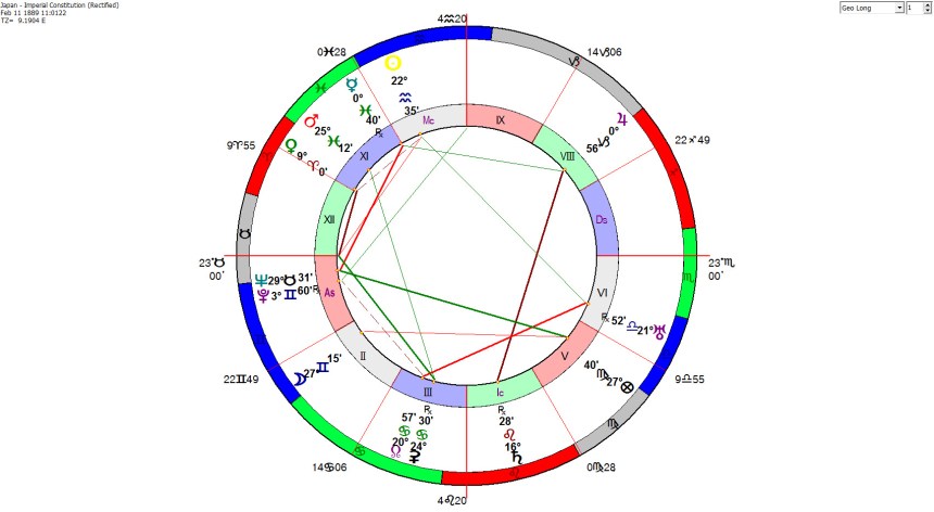 In the Japanese horoscope there is a Grand Trine in the Air element between the Sun – Moon – Uranus in the chart, suggesting an ideological vision of a refined and educated culture that encourages high aspirations for its people. The Sun in Aquarius reflects an intellectual leadership based on high-standing principles such as freedom, independence and individual rights. These set of placements would promote the development of a liberal democracy over time.