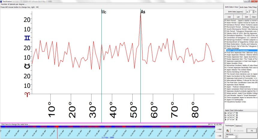 Another rectification graph (below) employing the 8th Harmonic Aspect Series, dividing the whole circle into eight parts -conjunction, semisquare, square, sesquisquare, and oppositions, again correlates reliably to historical “watershed” events to a foundation time of the national horoscope after 11:00 AM JST on February 11th, 1889, in Tokyo.