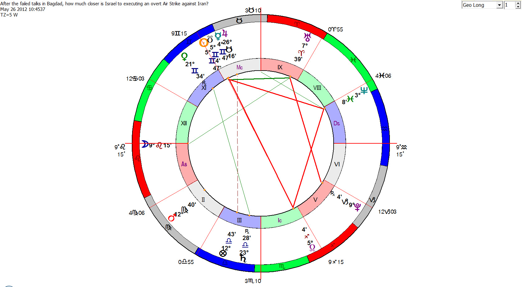 Based on the latest horary snapshot upon hearing the news report, “After the failed talks in Bagdad, how much closer is Israel to executing an overt Air Strike against Iran before midnight ET 31 Dec 2012?”, to probability for regional war in the Middle East went from a 32% to to 53%. Israel has withdrawn its pledge to US President Barack Obama not to strike Iran’s nuclear sites before the November presidential election after he rejected its minimal demands for nuclear negotiations with Iran.