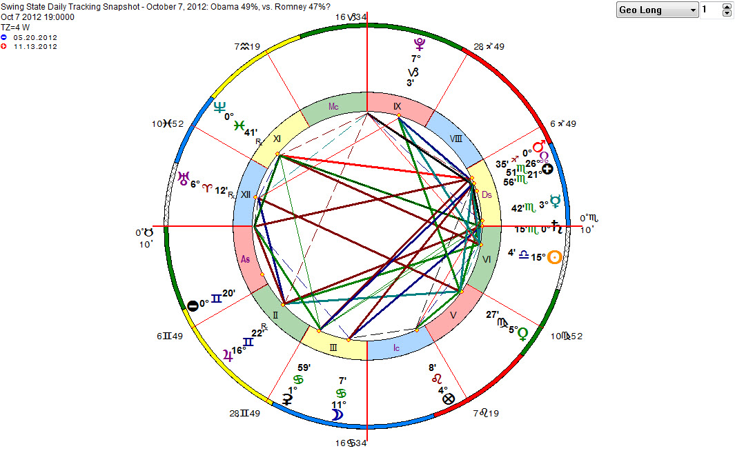To date, this closest the race has been seen September 29th with the GOP challenger gaining ground in the polls and the President losing it since Romney’s decisive debate win on Wednesday October 6th. Therefore the political “contest” horary question what is “Swing State Daily Tracking Snapshot – October 7, 2012: Obama 49%, vs. Romney 47%?” Horary question asked by the astrologer upon receiving the poll data upon its release on October 7th, 2012 at 7:00 pm EDT, New York, N.Y.