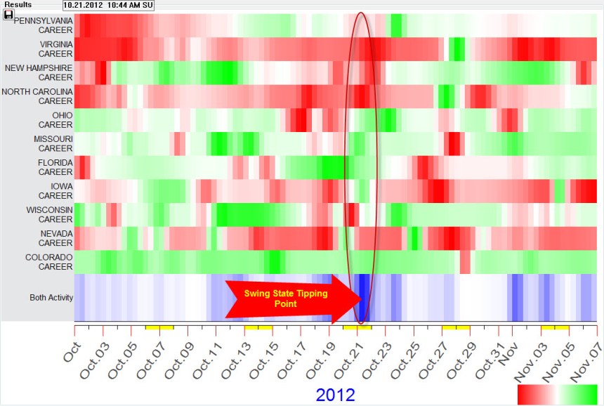 The Swing State Multi blackbox graph projects the total astrological activity (the last row) of the 11 key swing states from October 1st through November 7th 2012. The graph illustrates that the swing states of Nevada, North Carolina, New Hampshire, and Wisconsin, are fairly stressed (red), with Virginia most directly impacted on the peak activity date on October 20th 2012. Therefore it seems that we have reached the critical tipping point in the Presidential contest, with Virginia being the bellwether state that will likely influence the swing state voting trend in the closing days of the race and augur the Electoral College outcome in the 2012 election.
