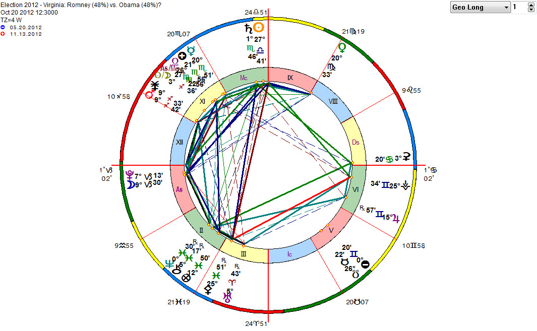 So the question is which candidate will win the critical battleground state of Virginia in the general election, “Election 2012 – Virginia: Romney (51%) vs. Obama (46%)?” Question asked by astrologer upon reading the CNN email alert on October 20th, 2012 at 12:30 pm EDT, New York, N.Y. According to Intrade, the world’s largest prediction market, Romney has a 55% chance of winning, with Obama at a 44% probability of winning the state of Virginia. Therefore Romney is the Favorite in the race and Obama the underdog.