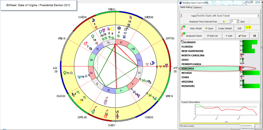Using the Blackbox Chart Rating Module with the Presidential Election Horoscope (Nov. 6th, 2012 at 12:01 am EST, in Dixville Notch, New Hampshire – the town best known in connection with its longstanding middle-of-the-night vote in the U.S. presidential election) rated against the State Horoscopes of the 11 projected key electoral college swing states it appears that North. Carolina, Iowa, and Pennsylvania, will be hotly contested states with Virginia being “Ground Zero” battleground state on Election Day Uranus-Pluto Square alignment is making an exact hit to “Old Dominion’s” Sun.