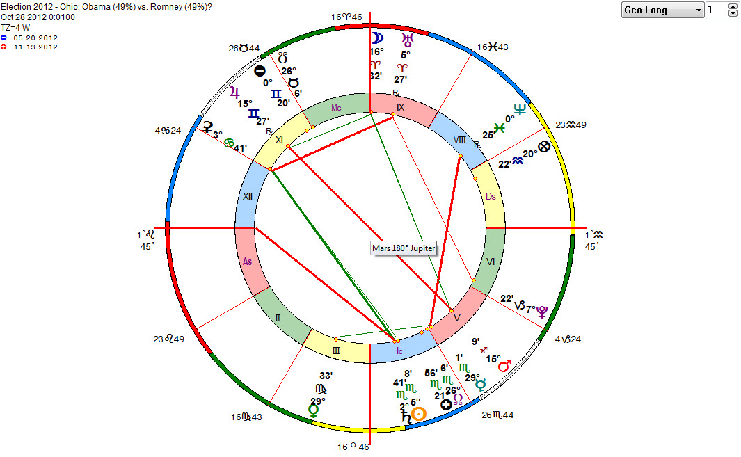 The results of this poll was published on the web today – October 28th, 2012 at 12:01 am EDT, in Cincinnati, Ohio. The political “contest” horary is based on this event. Intrade, the largest predictions market in the world, gives Obama a 67% chance of winning Ohio with Romney only a modest 33% chance. Therefore the President is clearly the Favorite with odds-makers and Romney the Underdog.