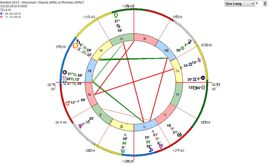 So the horary question is which candidate will is winning the BadgerState, “Election 2012 – Wisconsin: Obama (48%) vs. Romney (48%)?” Horary data based on the date and time of the release of the Rasmussen Report survey released it report on October 26th, 2012 at 09:30 am EDT, Asbury Park, N.J.