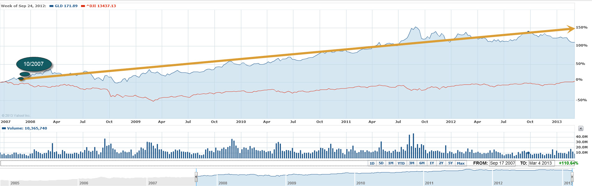 When the Dow last reached 14,000 in October of 2007, gold was around $700 an ounce. Today – 2013, with the Dow hovering over 14,000, Gold is around $1600 an ounce. If one invested $1000 in the Dow in 2007, in 2013 they would only have $985 saved in their portfolio with dividends reinvested. However if they invested a $1000 in Gold in 2007, by 2013 they would have $2,290 in their portfolio. Because of inflation and weakness in the U.S. Dollar due to increasing levels of government spending and rising sovereign debt, the Dow would have to be over well over 20,000 in order for it to be equivalent, in terms of real money – gold, to what is was worth prior to the 2008 financial meltdown.