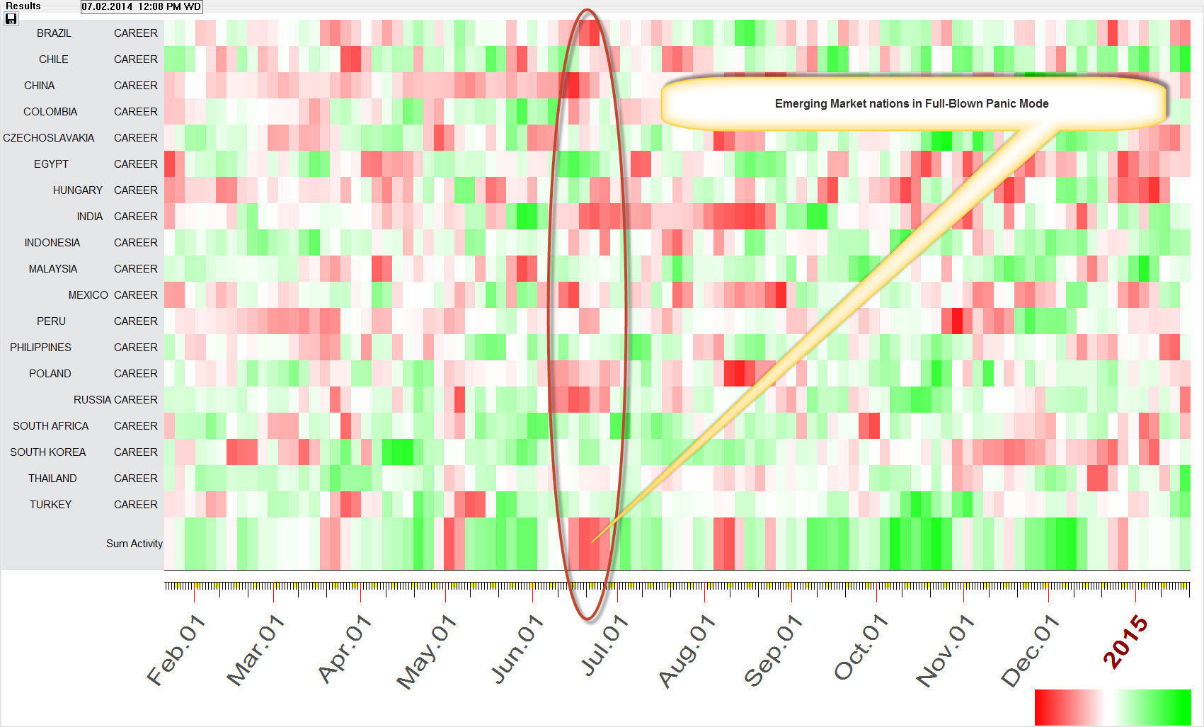 The emerging market tumble carries echoes of 1990s crisis and it is likely that we are at the beginning of another major wave of financial market unrest. Looking ahead, we can evaluate a 365-day forecast against each Emerging Market national horoscope, using a mutli-blackbox scheme using a model (created by astrologer Alphee Lavoie based on a Donald Bradley’s siderograph technique) which is essentially a curve based forecasting method based on transiting hits of planetary aspects.
