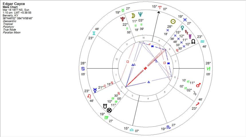 Quote (excerpted) from 254-2 “As in this body here [Edgar Cayce] born March 18, 1877, three minutes past three o’clock, with the Sun descending, on the wane, the Moon in the opposite side of the Earth (old moon), Uranus at its zenith, hence the body is ultra in its actions. Neptune closest in conjunction or Neptune as it is termed in Astrological survey, in the ninth house; Jupiter, the higher force of all the planets, save the Sun, in descendency, Venus just coming to horizon, Mars just set, Saturn – to whom all insufficient matter is cast at its decay – opposite the face of the Moon. Hence the inclination as the body is controlled by the Astrological survey at the time of the birth of this body, either (no middle ground for this body) very good or very bad, very religious or very wicked, very rich or always losing, very much in love or hate, very much given to good works or always doing wrong, governed entirely by the will of the body. Will is the educational factor of the body; thence the patience, the persistence, the ever faithful attention that should be given to the child when it is young” [GD’s note: I believe above birth data was volunteered because Mr. Thrash did not accept birth data from EC and parents.]