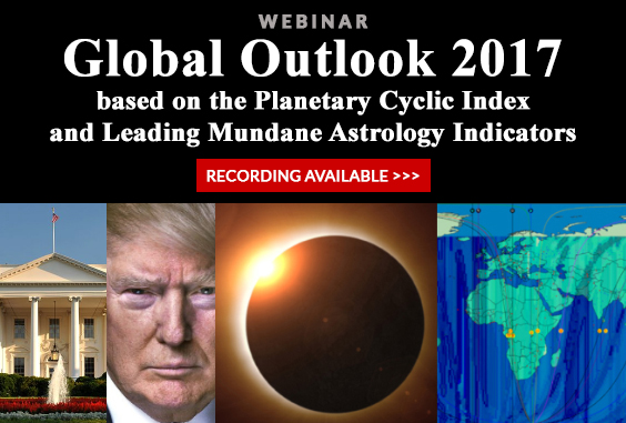 I invite you to listen to my recent webinar, Global Outlook 2017 based on the Planetary Cyclic Index and Leading Mundane Astrology Indicators to get a first look at what is in store for next year for the U.S., the top power countries, and on the world stage. The webinar was recorded live on January 1, 2017.