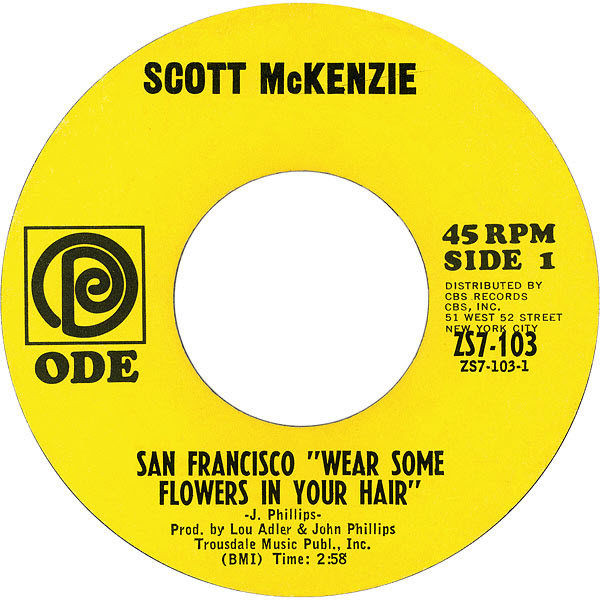 Released nearly month prior to the Summer of Love on May 13, 1967, the song “San Francisco (Be Sure to Wear Flowers in Your Hair)” written by musician John Phillips of the band The Mamas & the Papas served to promote both the upcoming Monterey Pop Festival (June 16, 1967) and to popularize the flower children of San Francisco. By the week ending July 1, 1967, it scored number four on the Billboard Hot 100 in the United States, where it remained for four consecutive weeks.