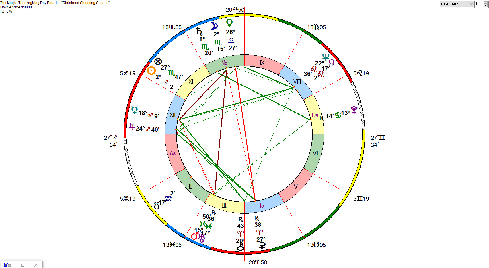 During the Roaring ’20s – a period of dramatic economic expansion and social experimentation – many of Macy’s department store employees were first-generation European immigrants who quickly reached middle-class status and were proud of their new American heritage, and sought to celebrate the American holiday season of Thanksgiving with the type of festival their parents had loved in Europe. The tradition started in 1924 at 9:00 am in Manhattan, New York (Note Jupiter in Sagittarius rising in the Event Horoscope). With an audience of over 250,000 people, the parade was such a success that Macy’s declared it would become an annual event.