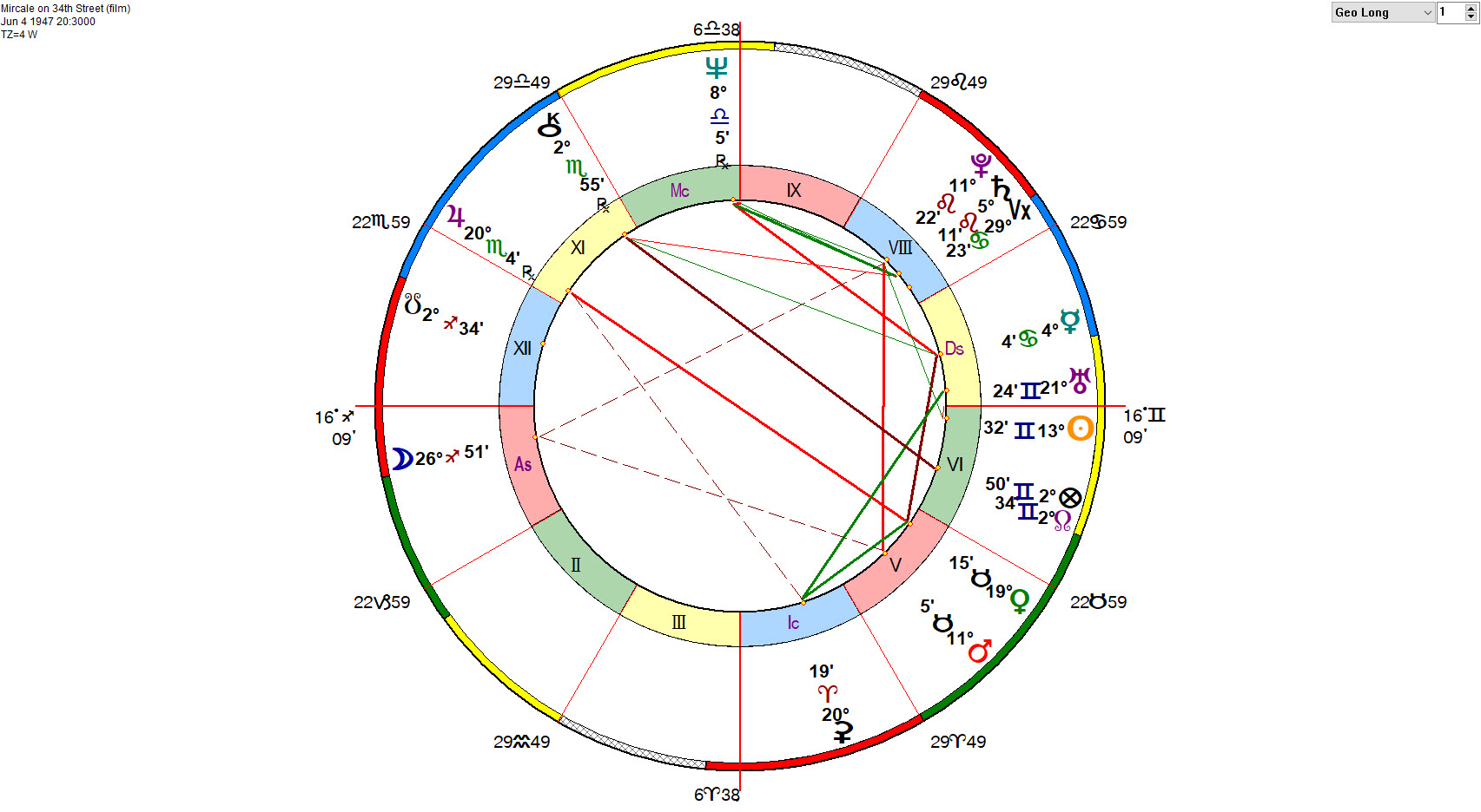 The world premiere horoscope of Miracle on 34th Street has Sagittarius on the Ascendant with the Moon rising, with a Sun-Uranus conjunction in Gemini, and highly tenanted Neptune being located at the top of the chart near the Midheaven. These portents represent how this is one of the most original films of its era that has stood the test of time and was able to draw out an impressive level of tongue-in-cheek humor alongside its sentimentality. Much of the delight in the film derives from Santa Claus himself, played by a perfectly casted Edmund Gwenn. The film’s charm is its touching displays of Christmas Magic, such as when he is able to speak Dutch with an orphan girl who knows him to be the real Santa.