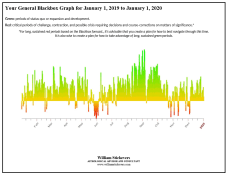 Using Donald Trump’s natal horoscope,  we can see this Blackbox which indicates and shows all the planetary transits and solar arcs making direct hits to his natal chart, from January 20th, 2017 to January 20th, 2021. We see that during the time of the election he was hitting a high, a very strong peak. And we can see here that through 2018 he’s had his ups and downs, and then there will be a low point sometime around in May-June of 2019. But at that point, the Blackbox scoring starts improving and moving up until November 3rd, 2020.