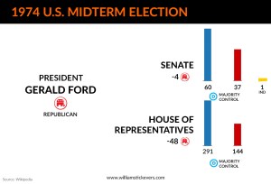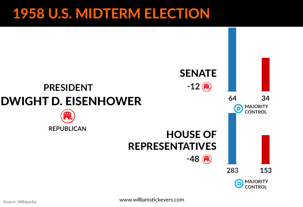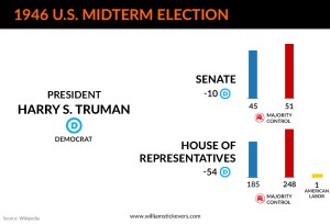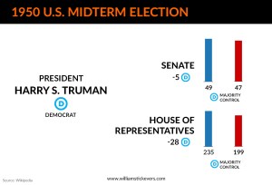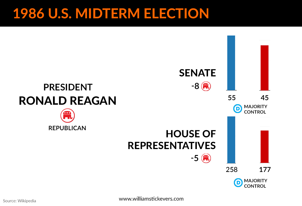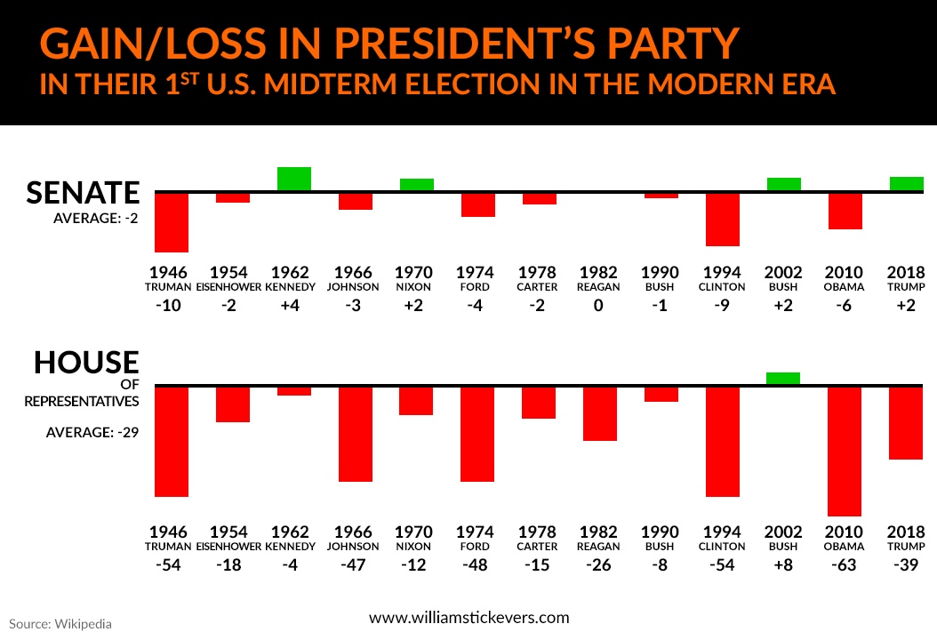 In this graph of seats gained or lost in the President’s party in the first-term Midterm election in the modern era, we see that Harry Truman – who is considered one of the most successful Presidents of all time – lost 54 House seats in his first Midterm election and 10 Senate seats, and went on to win decisively in a very large turnout two years later where he won by one of the most significant landslides in history up until Reagan. In President Ronald Reagan’s first Midterm election, he lost 26 House seats but went on to the largest landslide of all time in his reelection bid.