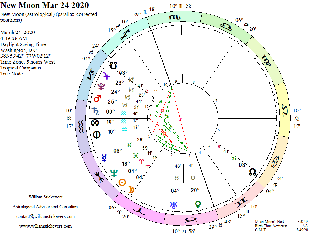 The March 24th New Moon at 04°11′ Aries marks the beginning of a new annual cycle as it occurs shortly after the Aries Ingress – the astrological New Year on March 19th. The New Moon is within orb to the World Point (0° Aries), signifying a dramatic out-rush of archetypal power and planetary force on the world stage, and making this a challenging New Moon that seems appropriate given the dramatic and unprecedented circumstances of the coronavirus pandemic, and the escalating financial market meltdown threatening recession due to the breakdown of global supply chains exacerbated by the worldwide coordinated effort to slow down and stop the spread of the coronavirus.