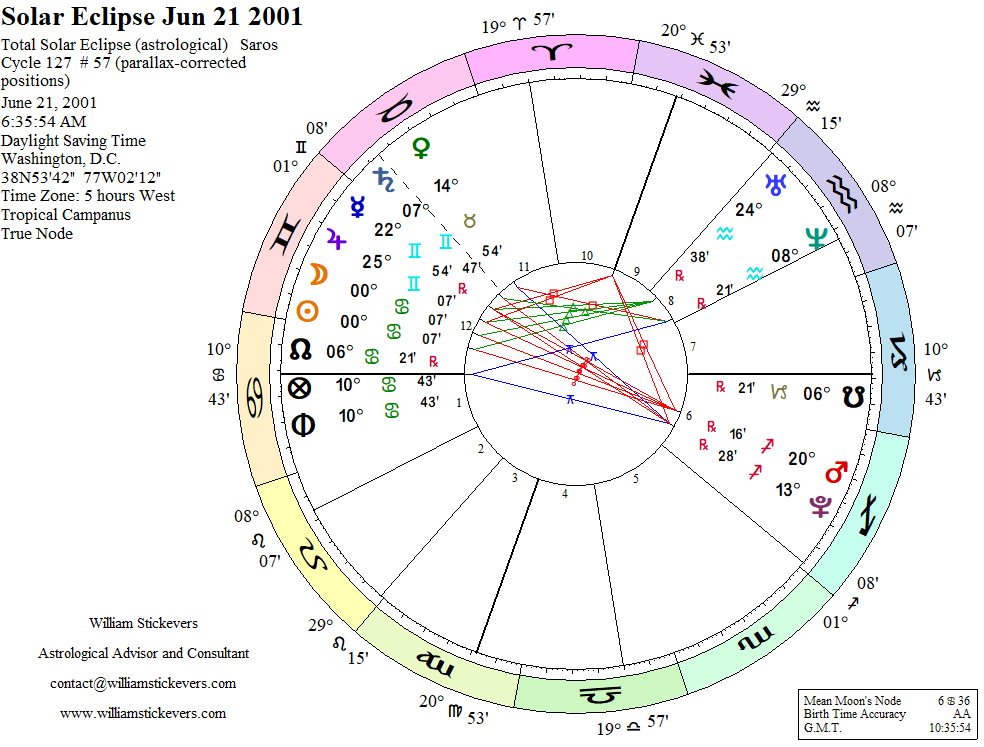 The June 21st Solar Eclipse will occur in 0° Cancer. The World Points are located at zero degrees on the Cardinal Signs (Aires, Cancer, Libra, and Capricorn). According to mundane astrologer Bill Meridian, planets at the World Point release archetypal planetary energy on the world stage with great force and immediacy. For example, nineteen years ago on June 21, 2001 there was a Solar Eclipse at 0° Cancer. When transiting Mars in Capricorn opposed this point in September 8th, 2001, the 9/11 Terrorist Attacks took place shorty after in New York and Washington, D.C. Because the June 21st Solar Eclipse is at 0° Cancer, the eclipse will have a major impact on world affairs.