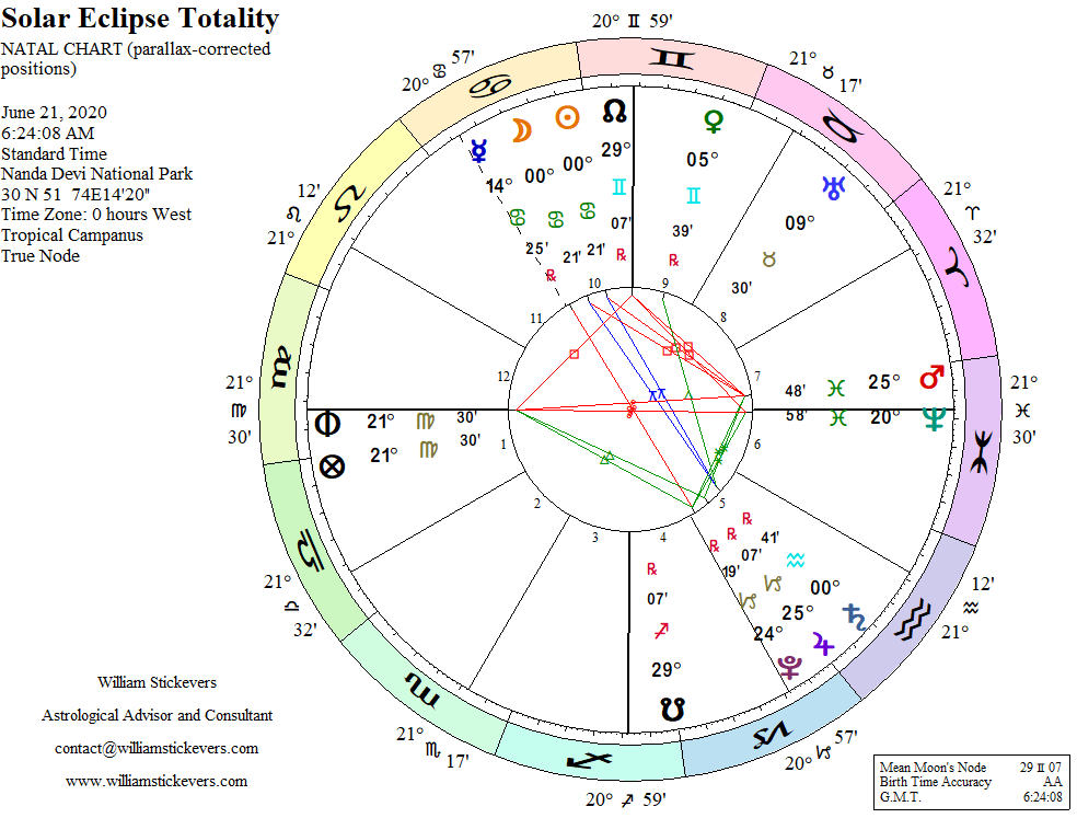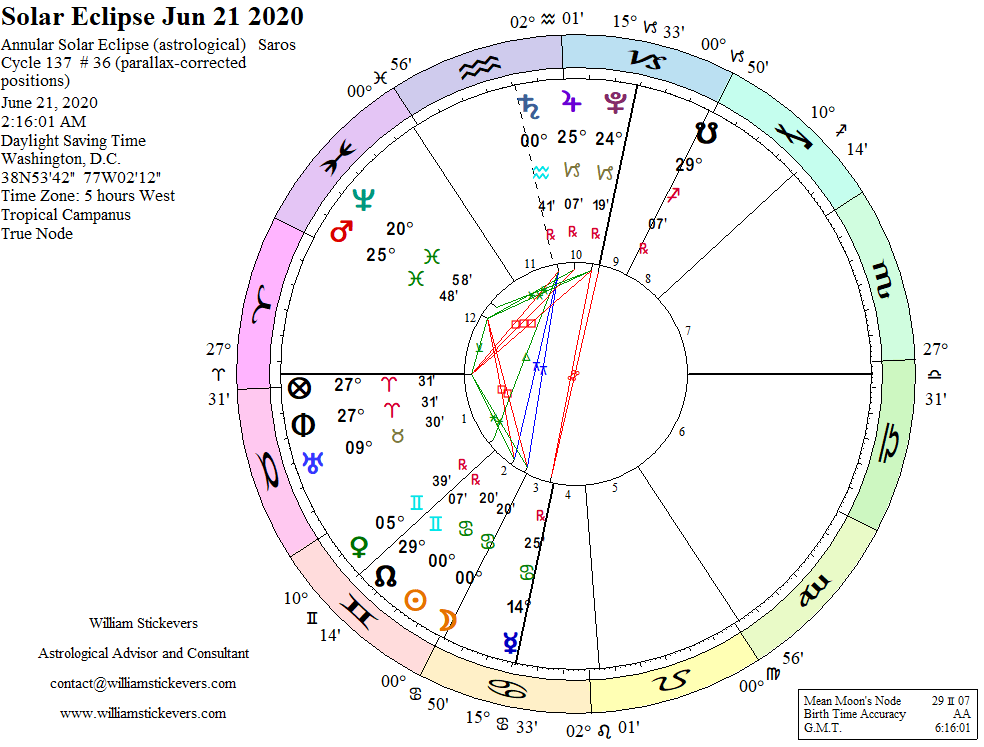 The June 21st Solar Eclipse is part of the series of eclipses on the Cancer–Capricorn axis. These eclipses that began with the Partial Solar Eclipse at 20°30’ Cancer on July 12, 2018, continued throughout 2019 with the Partial Solar Eclipse at 15°28’ Cancer on January 5, 2019, the Total Solar Eclipse at 10°40’ Cancer on July 2, 2019, followed by the Annular Solar Eclipse at 04°07’ Capricorn on December 26, 2019, and into 2020 shortly after the Summer Solstice with the Annular Solar Eclipse at 00°21’ Cancer on June 21st Eclipse, when they will be completed.