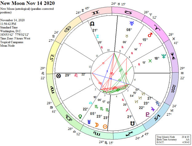 The November 14 New Moon at 23°17′ Scorpio is well-aspected by sextile to Jupiter conjunct Pluto. The harmony-seeking sextile aspect brings out the best qualities of the Jupiter-Pluto conjunction like authentic personal breakthroughs and profound revelations that lead to success.