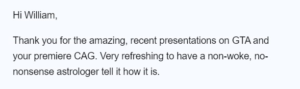 In his Global Transformation Astrology (GTA) membership, William gives two webinars with Q&A every month with research and analysis of real-world economies, finance, and geopolitics with an archetypal and traditional and modern mundane astrological perspective, plus a monthly Ask Me Anything session.