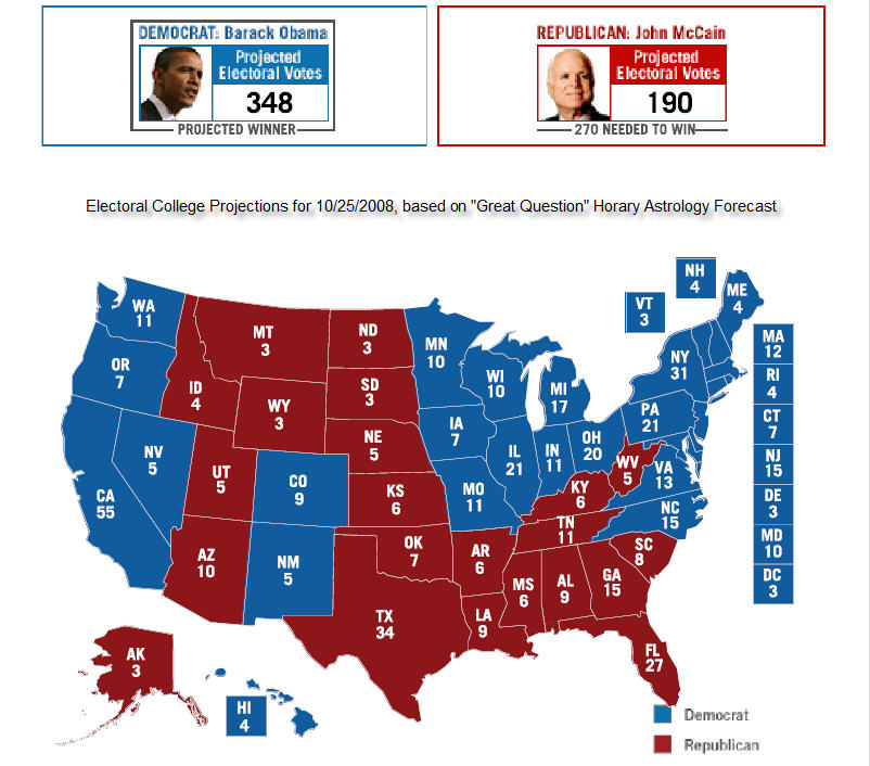 Outcome: Inconclusive. The race in Ohio is still in play. For the moment the Republicans have the edge, but the astrological testimonies do not point to a McCain victory at this time.