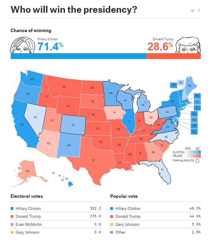 Below are projections for the 2016 U.S. Presidential Election as of November 7, 2016.